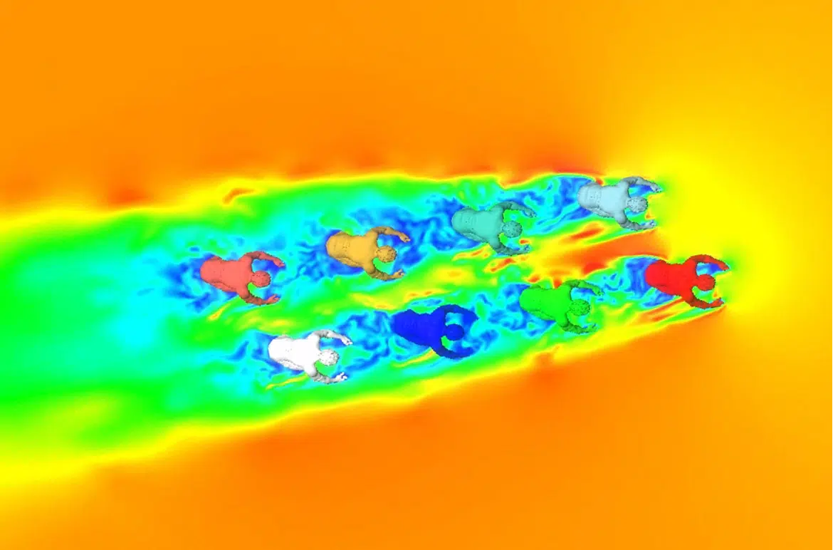 The performance of cyclists in a peloton is largely influenced by the fluid dynamics developing around them.