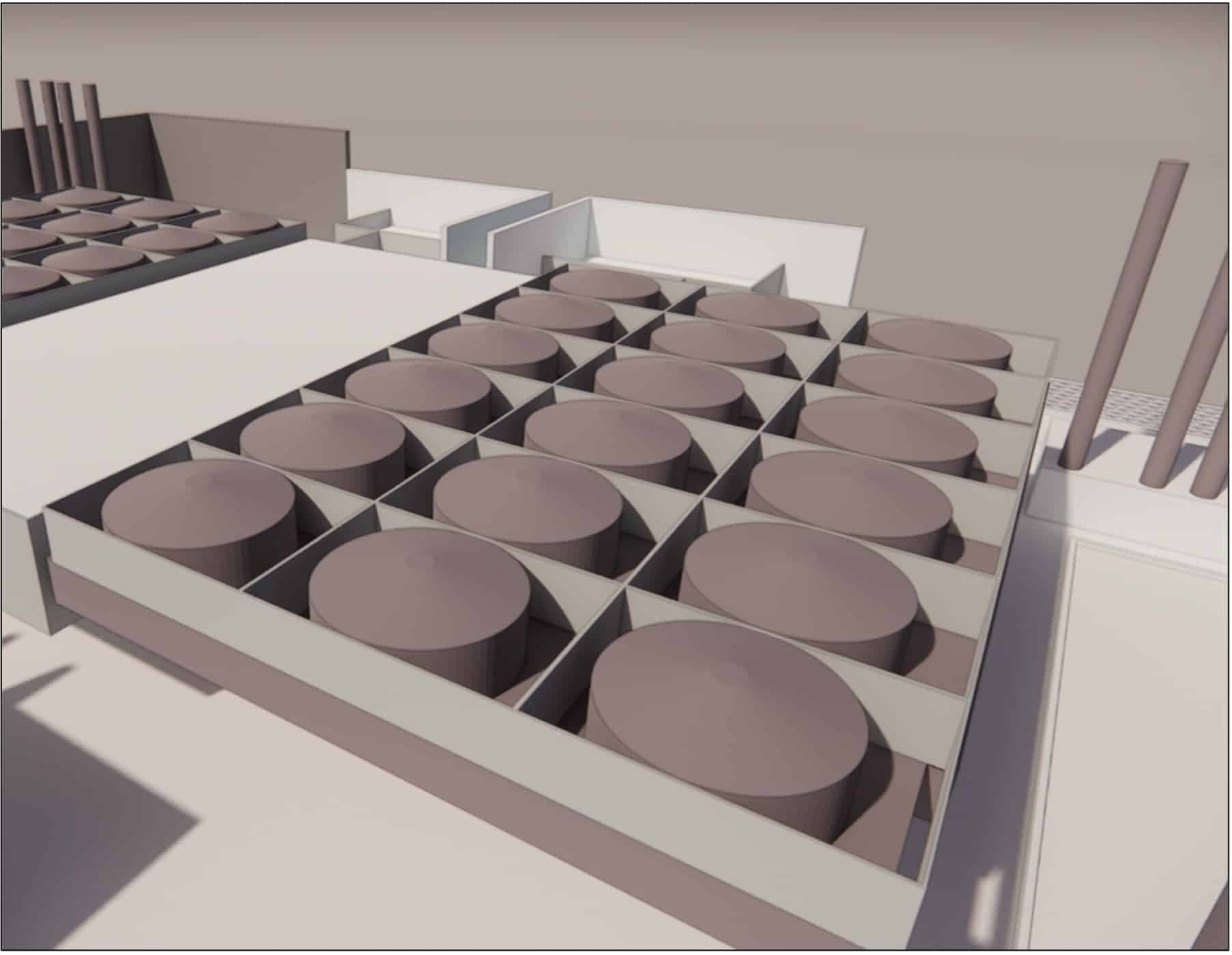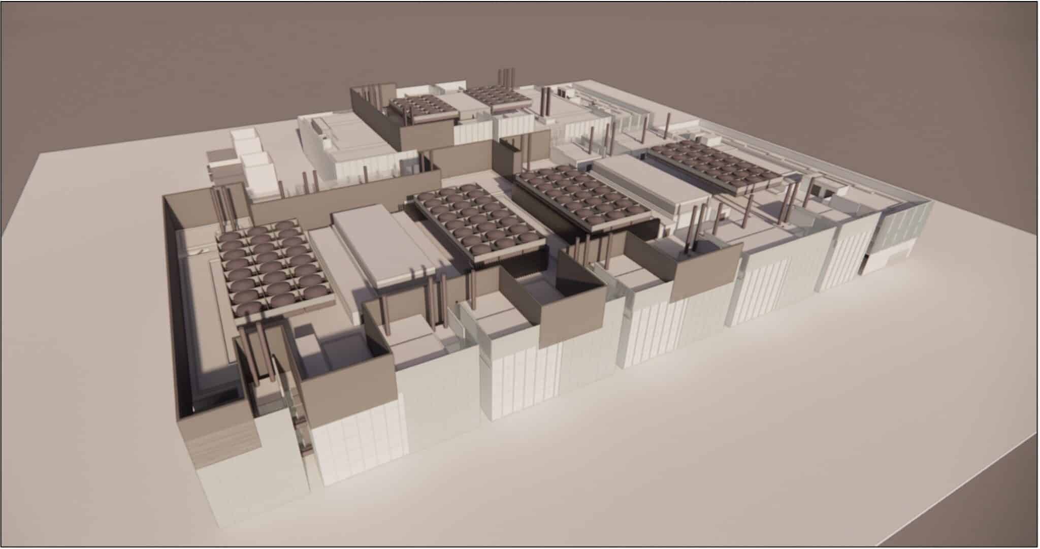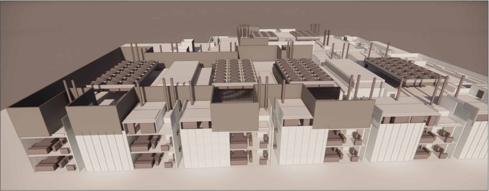 Precise 3D modeling of infrastructures, such as the roof of a hyperscale datacenter equipped with ventilation hoods, enables all critical systems and their interaction to be visualized. The modeled structure includes hood modules, ventilation networks, access walkways and the optimized layout of cooling units.