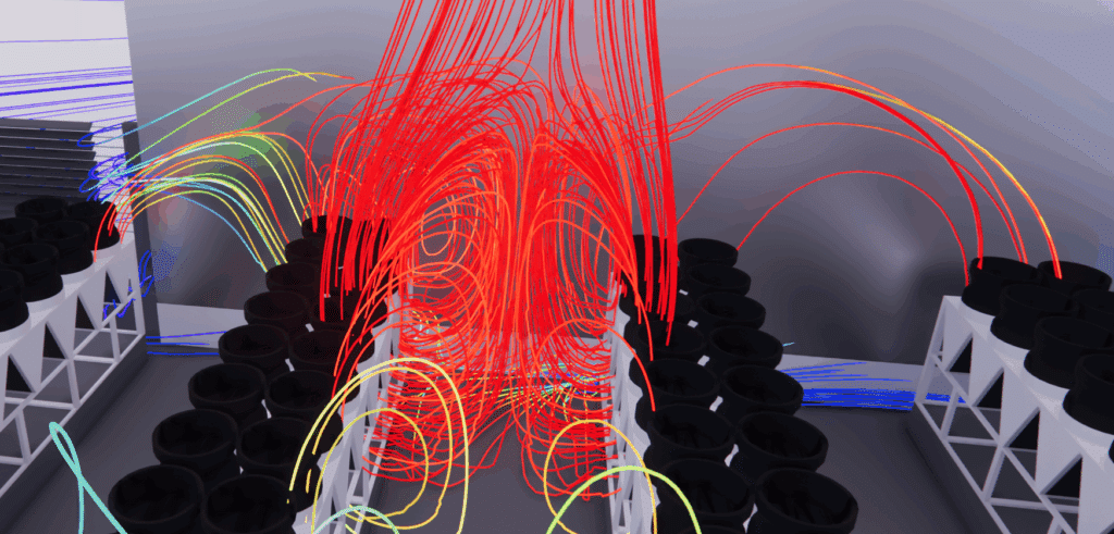 CFD analysis allows us to understand how several systems will interact with each other. The video below shows the impact of exhaust air (thermal plume) from generators in relation to rooftop air-conditioning equipment.
