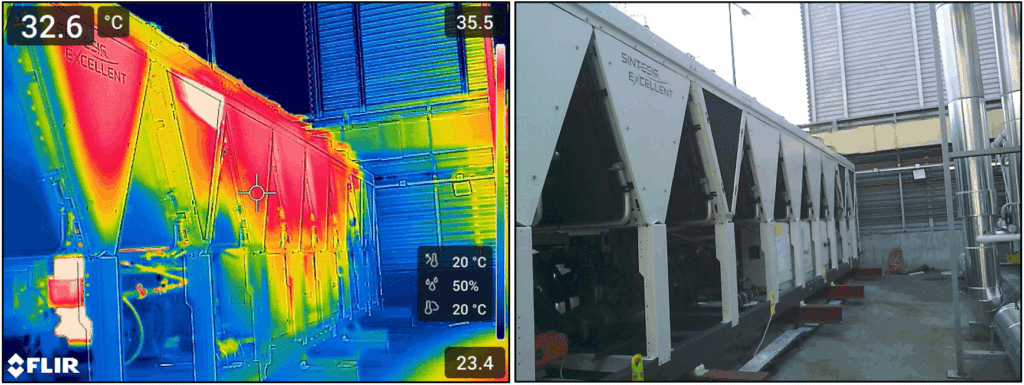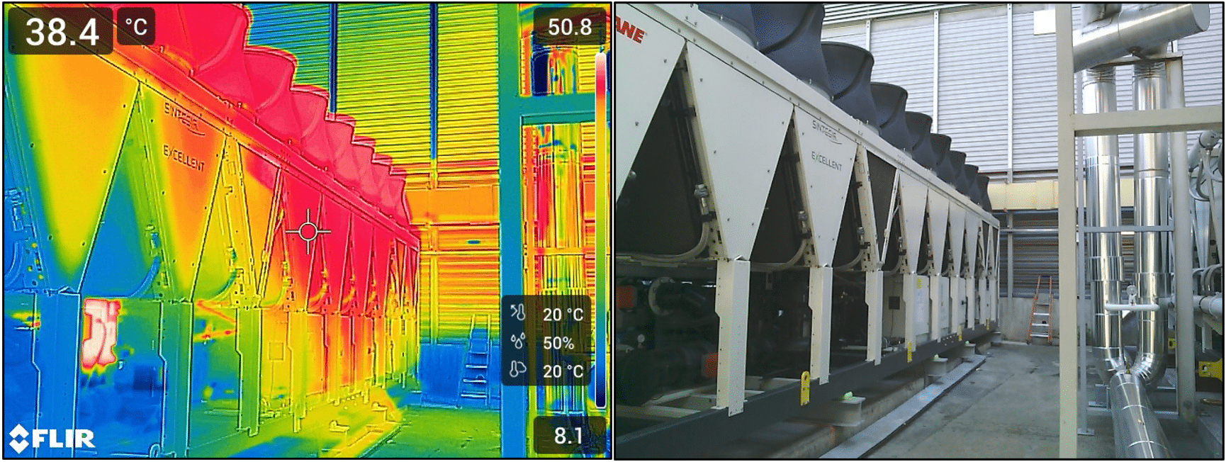 In addition to machine emissions alone, the morphology of the technical area on the ground contributes to this accumulation: cluttered surroundings, partial cowlings that deflect jets without lifting them out of the suction zone, cable and network routes that reduce free cross-sections and generate aeraulic shadows. Under certain wind conditions, these obstacles create local loops and wall effects that delay heat dissipation, promote plume coalescence and accentuate temperature rises at the foot of the unit. All these findings explain the over-temperature detected by thermography around the air coolers, and justify targeted deflection and filtering actions (continuous hoods, oriented louvers) to break the loops, open up the flows and purify the intake air.