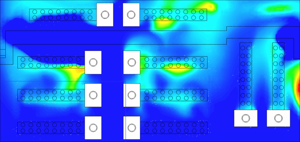 The central zone is less susceptible to thermal recirculation. The mixing induced around the generators creates a more energetic exchange volume, effectively decoupling the main discharges from neighboring aspirations and promoting rapid dilution of the plumes. Under prevailing winds, the streamlines follow the local morphology – flow corridors, lateral clearances, stalls – which limits the formation of persistent low-velocity zones. As a result, air velocity planes show stable, legible trajectories, with controlled gradients at air intakes.
